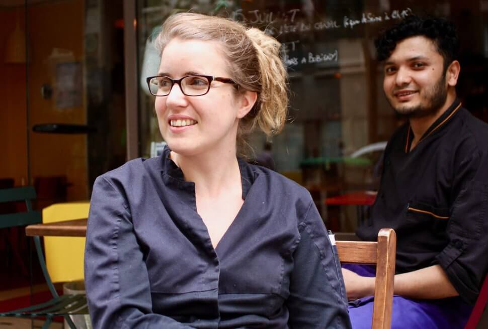 La carte offre le choix parmi 3 entrées, 3 plats et 3 desserts. Tout est fait maison avec des fruits et légumes bio produits en Ile-de-France, et de la viande française ! Les assiettes offrent une base de céréales ou légumineuses, auxquelles sont ajoutés des légumes variés travaillés de différentes façons (du cru, du cuit, du fondant, du croquant etc) et un élément carné ou végétarien. Le jour de notre visite, on déguste en plat végétarien un joyeux mélange riz/lentilles accompagné de champignons farcis au chèvre, d’un moelleux clafouti salé, carottes au cumin, fenouil à l’orange et dés d’aubergines fondantes. Le tout parsemé de jeunes pousses. Résultat : des plats colorés, riches en textures et saveurs. En entrée, on se laisse séduire par l’alléchant gaspacho de concombre à la menthe, servi bien frais. Une équipe bien sympa pour un repas qui l’est tout autant.